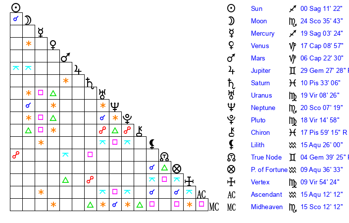 Sun | 0 Sagittarius 12 | 0 Sagittarius 53 | 0 Aquarius 12 |