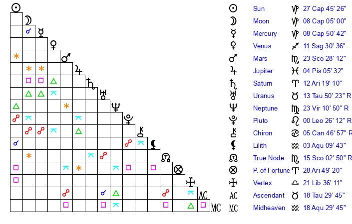 | Moon | 7 Capricorn 59 | 25 Virgo 10 | 27 Aquarius 20 |