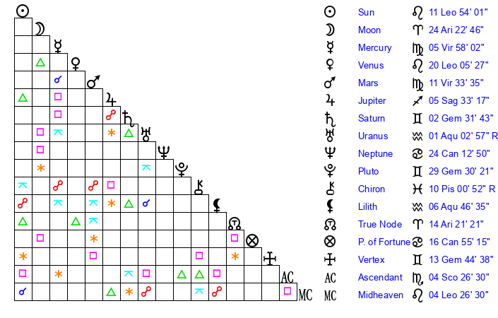 | Moon | 24 Aries 16 | 17 Sagittarius 34 | 16 Gemini 26 |