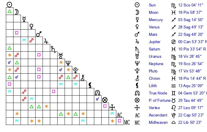 Sun | 12 Scorpio 4 | 12 Scorpio 46 | 11 Capricorn 52 |