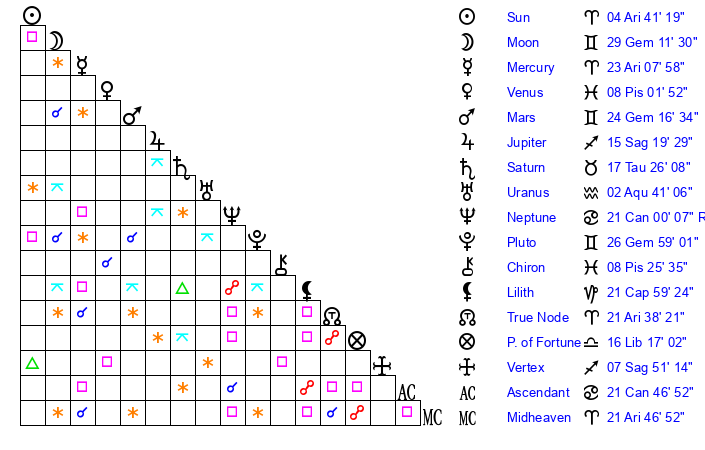 | Pluto | 26 Gemini 59 | 3 Aquarius 26 | 29 Gemini 7 |