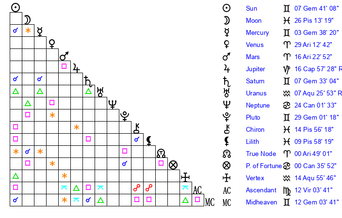 | Mercury | 3 Gemini 39 | 8 Gemini 0 | 26 Virgo 55 |