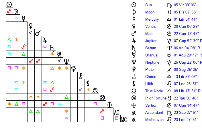 Mercury | 1 Libra 34 | 21 Leo 4 | 19 Virgo 0 |