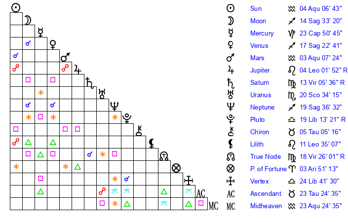 | Sun | 4 Aquarius 7 | 4 Aquarius 58 | 20 Pisces 31 |