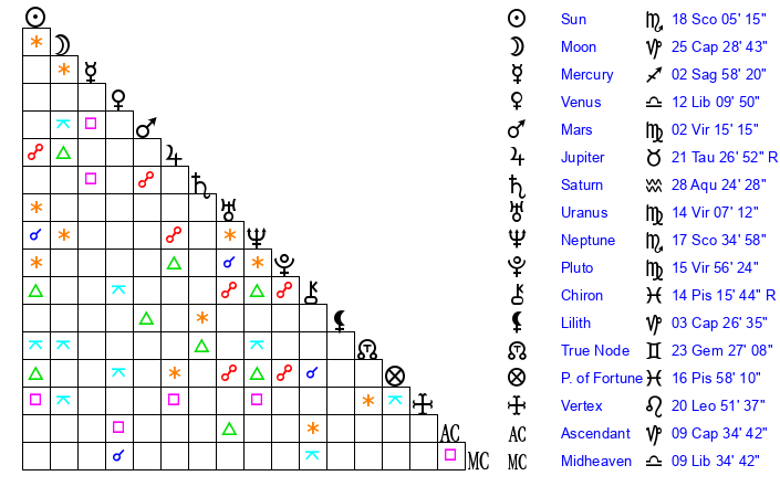 | Sun | 18 Scorpio 5 | 18 Scorpio 32 | 18 Capricorn 59 |