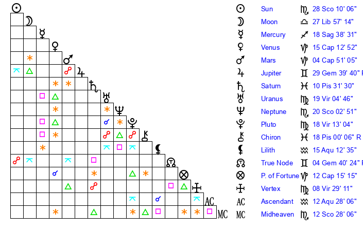 Sun | 28 Scorpio 10 | 28 Scorpio 52 | 28 Capricorn 10 |