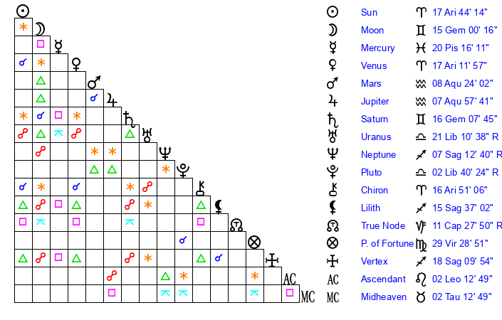 Sun | 17 Aries 44 | 18 Aries 7 | 8 Gemini 10 |