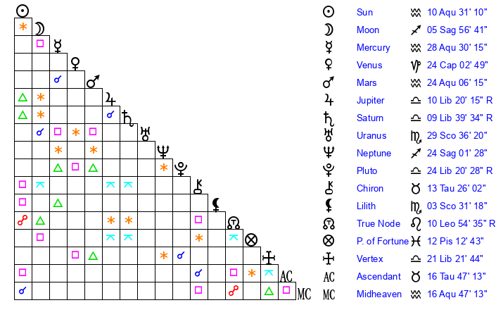 | Mercury | 28 Aquarius 30 | 3 Aquarius 54 | 27 Aquarius 13 |