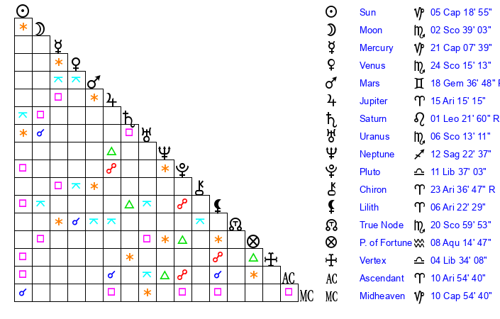 | Pluto | 11 Libra 37 | 0 Aquarius 56 | 11 Libra 26 |