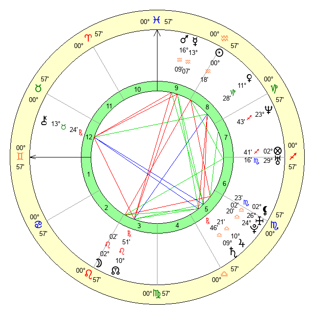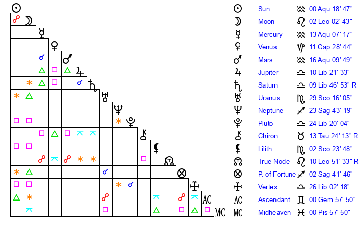 | Moon | 2 Leo 0 | 15 Libra 29 | 1 Pisces 40 |