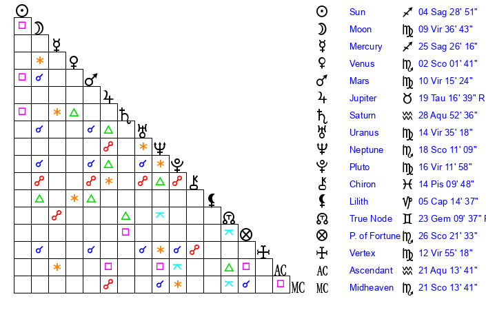 | Neptune | 18 Scorpio 11 | 27 Pisces 9 | 19 Scorpio 49 |