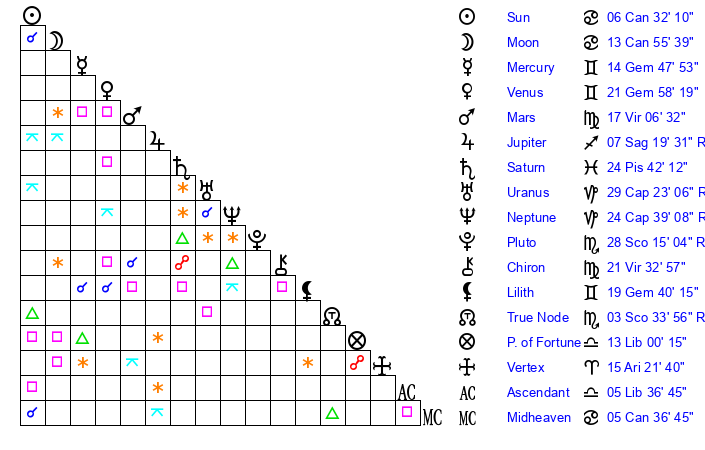 Venus | 21 Gemini 58 | 23 Taurus 30 | 28 Cancer 44 |