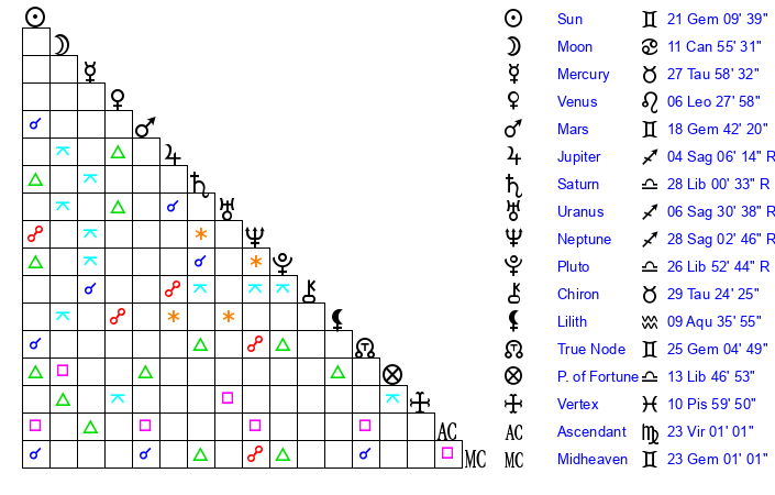| Sun | 21 Gemini 10 | 21 Gemini 58 | 1 Leo 14 |