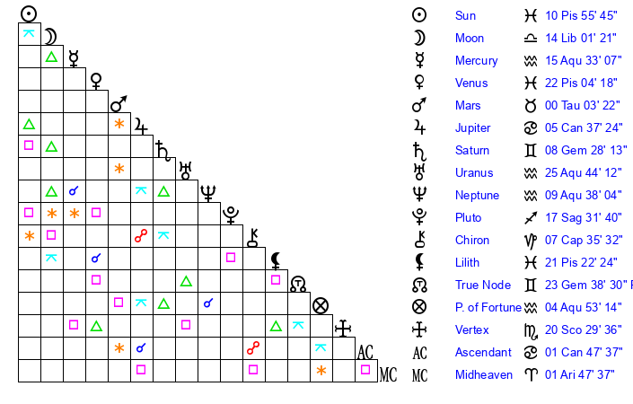 Mercury | 15 Aquarius 34 | 27 Pisces 26 | 21 Pisces 0 |