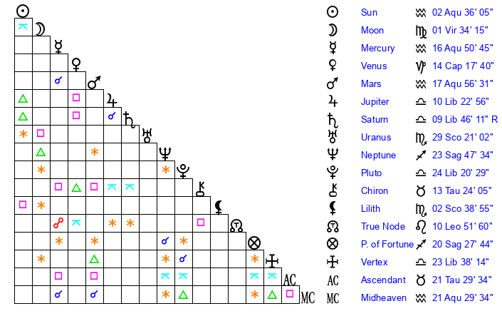 | Sun | 2 Aquarius 36 | 2 Aquarius 56 | 17 Pisces 2 |