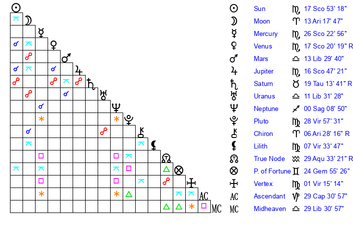 Jupiter | 16 Scorpio 40 | 19 Gemini 37 | 27 Scorpio 58 |