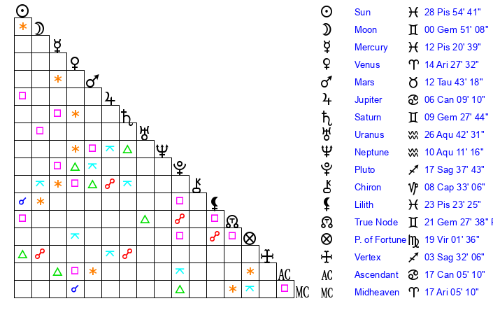 Moon | 0 Gemini 51 | 28 Scorpio 12 | 9 Aries 32 |