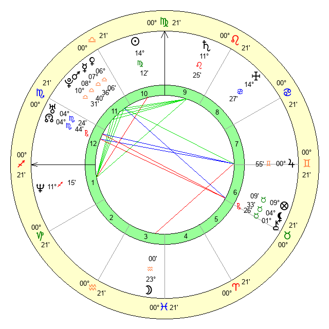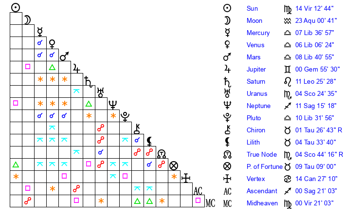 | Sun | 14 Virgo 12 | 14 Virgo 21 | 2 Scorpio 24 |
