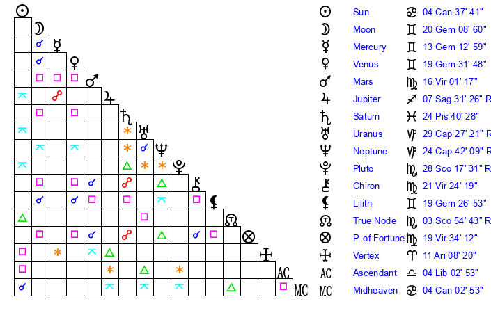 Mercury | 13 Gemini 12 | 29 Cancer 53 | 1 Leo 39 |