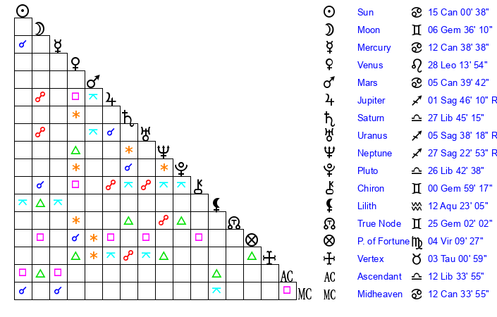 | Moon | 6 Gemini 32 | 9 Sagittarius 30 | 1 Capricorn 33 |