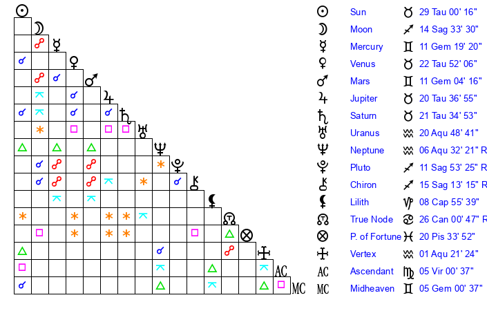 Sun | 29 Taurus 0 | 28 Taurus 58 | 22 Gemini 58 |