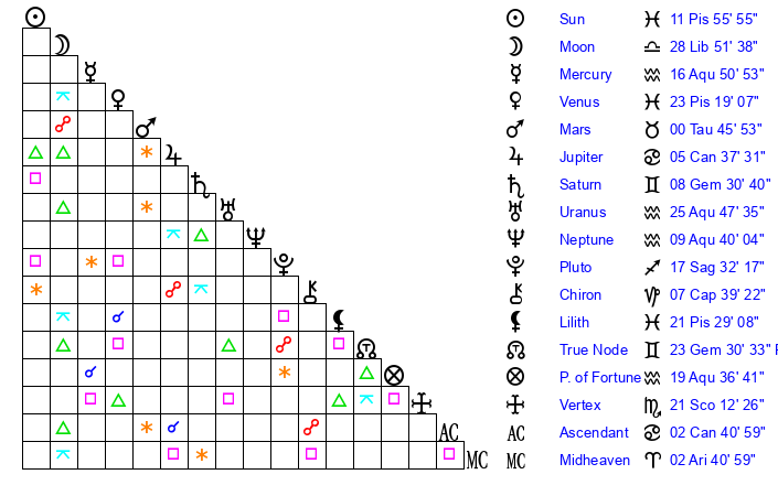 Mercury | 16 Aquarius 51 | 29 Pisces 0 | 22 Pisces 48 |