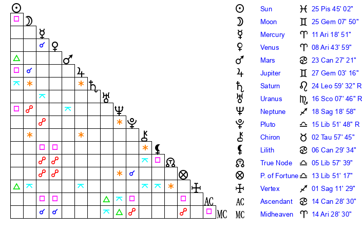 | Sun | 25 Pisces 45 | 26 Pisces 21 | 11 Taurus 56 |