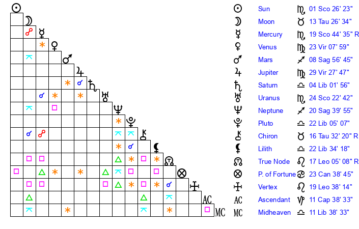 | Mercury | 19 Scorpio 44 | 24 Scorpio 43 | 4 Sagittarius 24 |