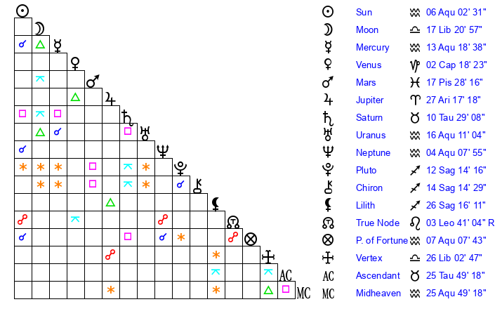 Sun | 6 Aquarius 3 | 7 Aquarius 0 | 1 Pisces 22 |