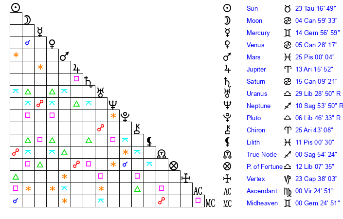| Sun | 23 Taurus 16 | 24 Taurus 9 | 11 Cancer 8 |