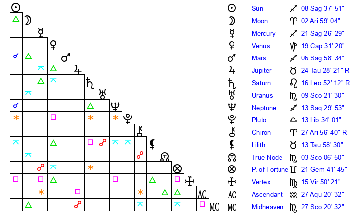 | Neptune | 13 Sagittarius 30 | 27 Pisces 8 | 15 Sagittarius 11 |