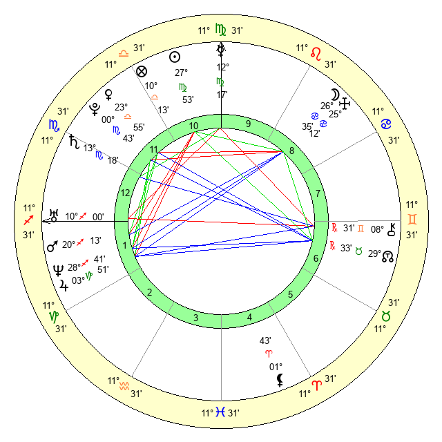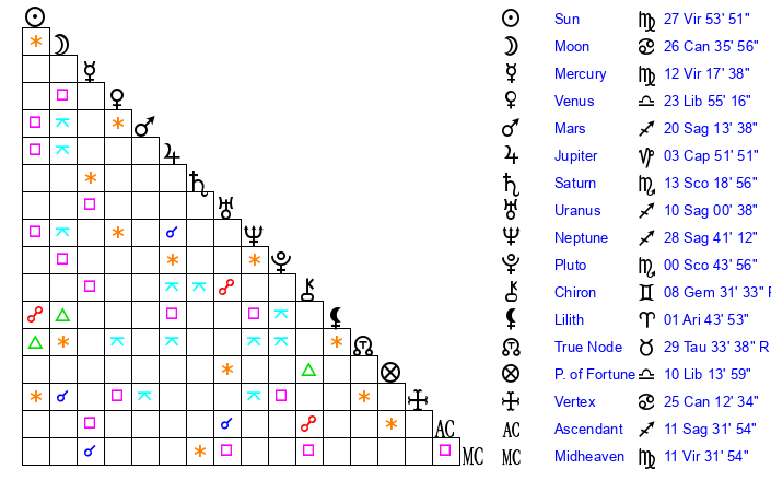 | Sun | 27 Virgo 54 | 27 Virgo 59 | 8 Scorpio 28 |
