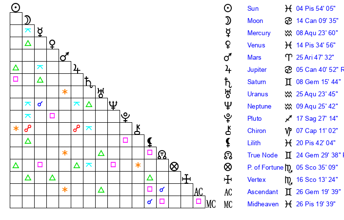Sun | 4 Pisces 54 | 5 Pisces 20 | 27 Pisces 55 |