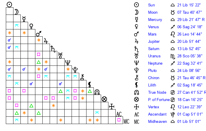 | Pluto | 24 Libra 9 | 1 Aquarius 21 | 25 Libra 49 |
