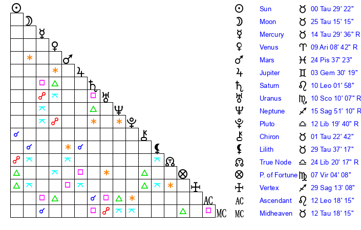 | Mercury | 14 Taurus 29 | 3 Aries 36 | 25 Taurus 3 |