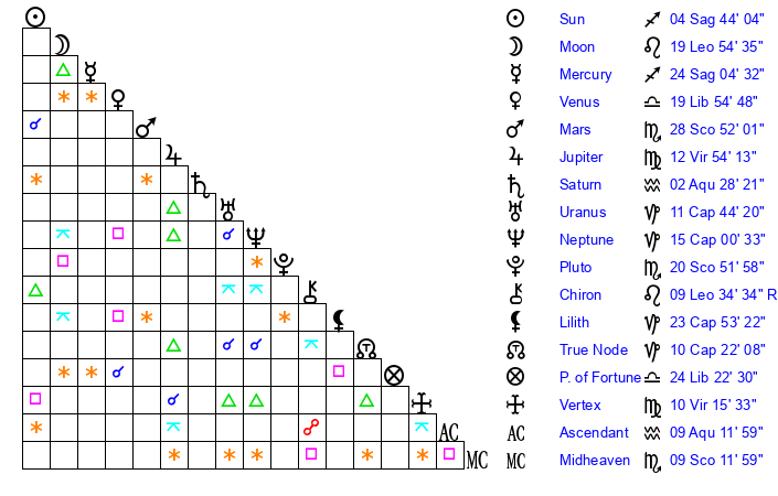 | Moon | 19 Leo 42 | 26 Aquarius 3 | 19 Scorpio 54 |