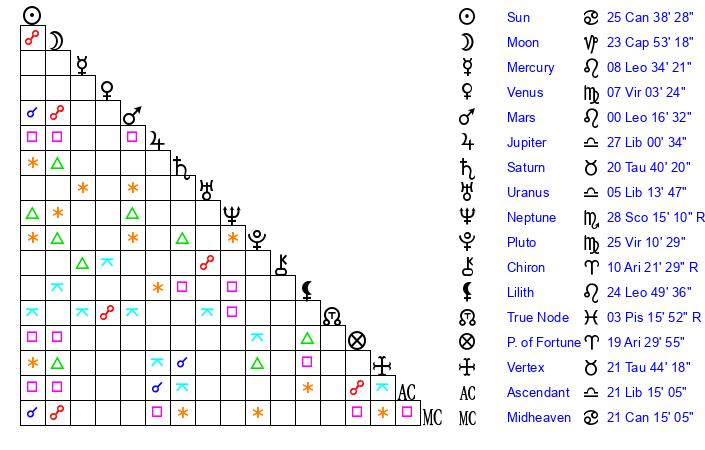 Sun | 25 Cancer 38 | 26 Cancer 19 | 18 Virgo 32 |