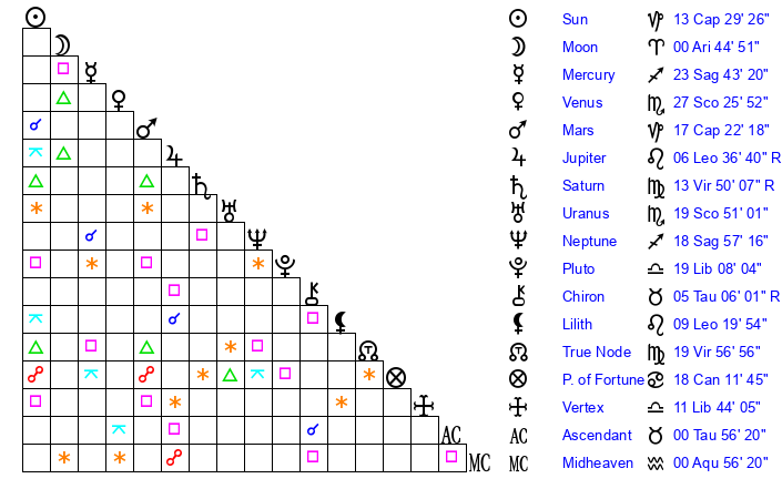 | Moon | 0 Aries 38 | 11 Pisces 18 | 22 Scorpio 50 |