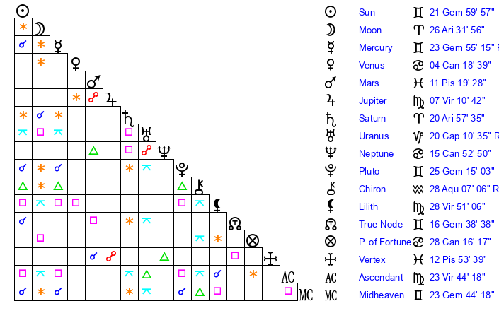 | Pluto | 25 Gemini 15 | 3 Aquarius 27 | 26 Gemini 52 |