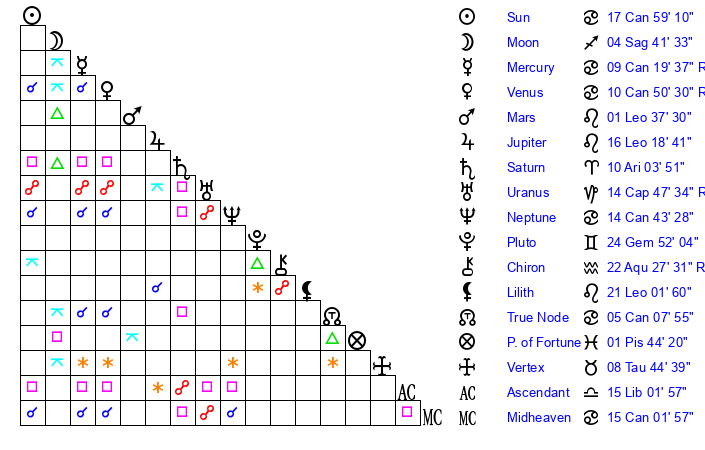 | Neptune | 14 Cancer 44 | 2 Aries 9 | 17 Cancer 3 |