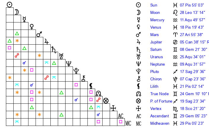 Sun | 7 Pisces 55 | 8 Pisces 21 | 0 Aries 54 |