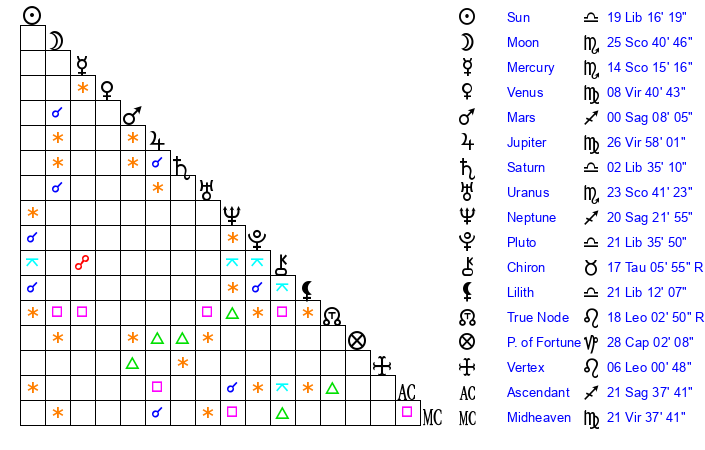 | Saturn | 2 Libra 57 | 26 Pisces 49 | 7 Libra 44 |