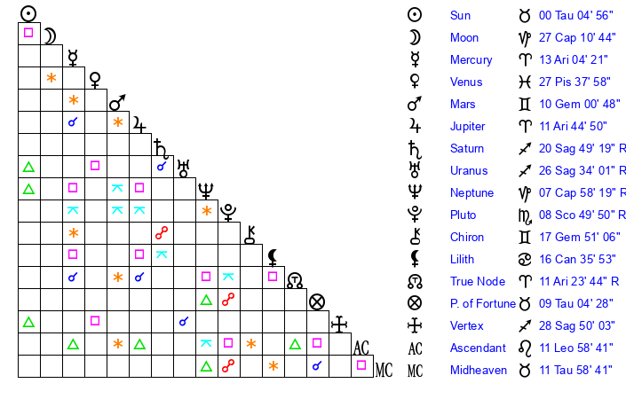 | Moon | 27 Capricorn 11 | 26 Capricorn 25 | 18 Gemini 49 |