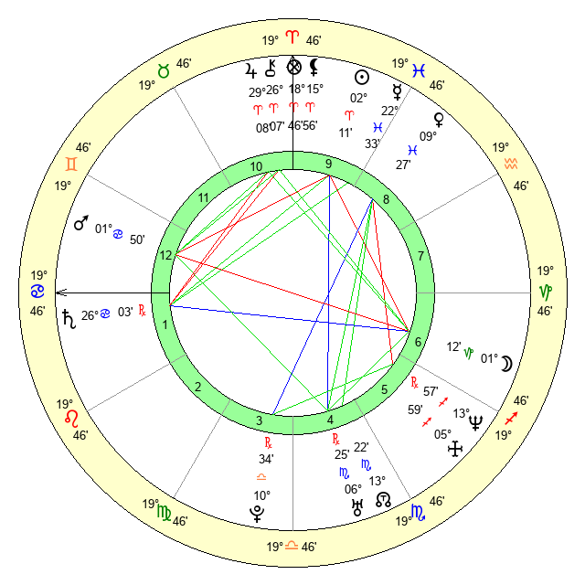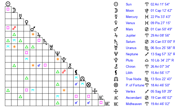 | Saturn | 26 Cancer 26 | 23 Pisces 17 | 28 Cancer 4 |