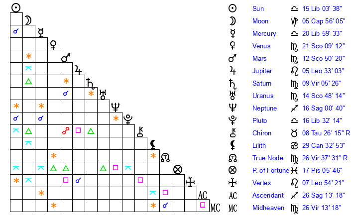 | Sun | 15 Libra 3 | 15 Libra 40 | 2 Sagittarius 4 |