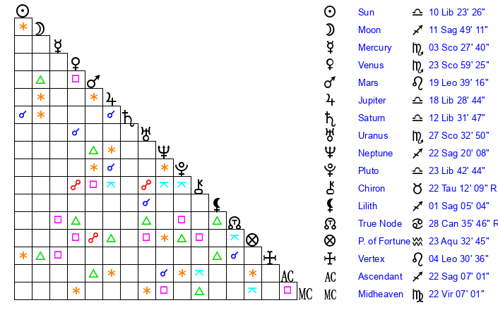 | Venus | 23 Scorpio 59 | 17 Virgo 24 | 11 Capricorn 13 |