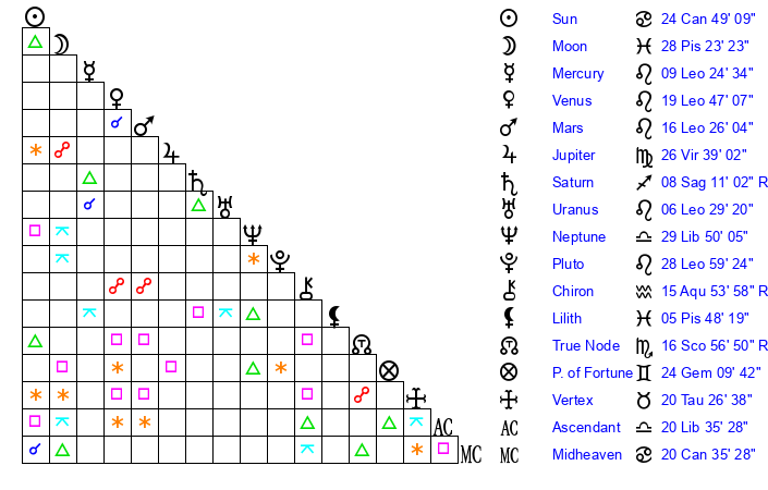| Moon | 28 Pisces 20 | 21 Aries 6 | 28 Virgo 56 |