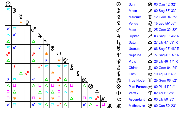 | Neptune | 27 Sagittarius 46 | 2 Aries 7 | 26 Sagittarius 47 |