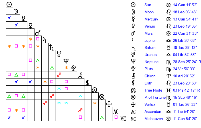 Sun | 14 Cancer 12 | 14 Cancer 52 | 6 Virgo 54 |