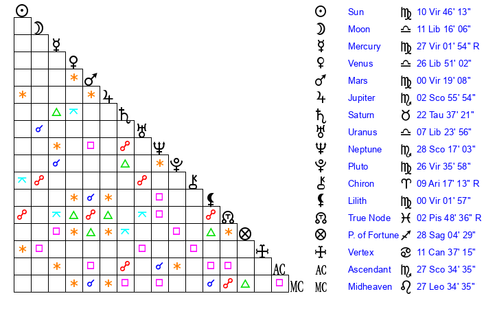 Pluto | 26 Virgo 35 | 1 Aquarius 43 | 28 Virgo 34 |